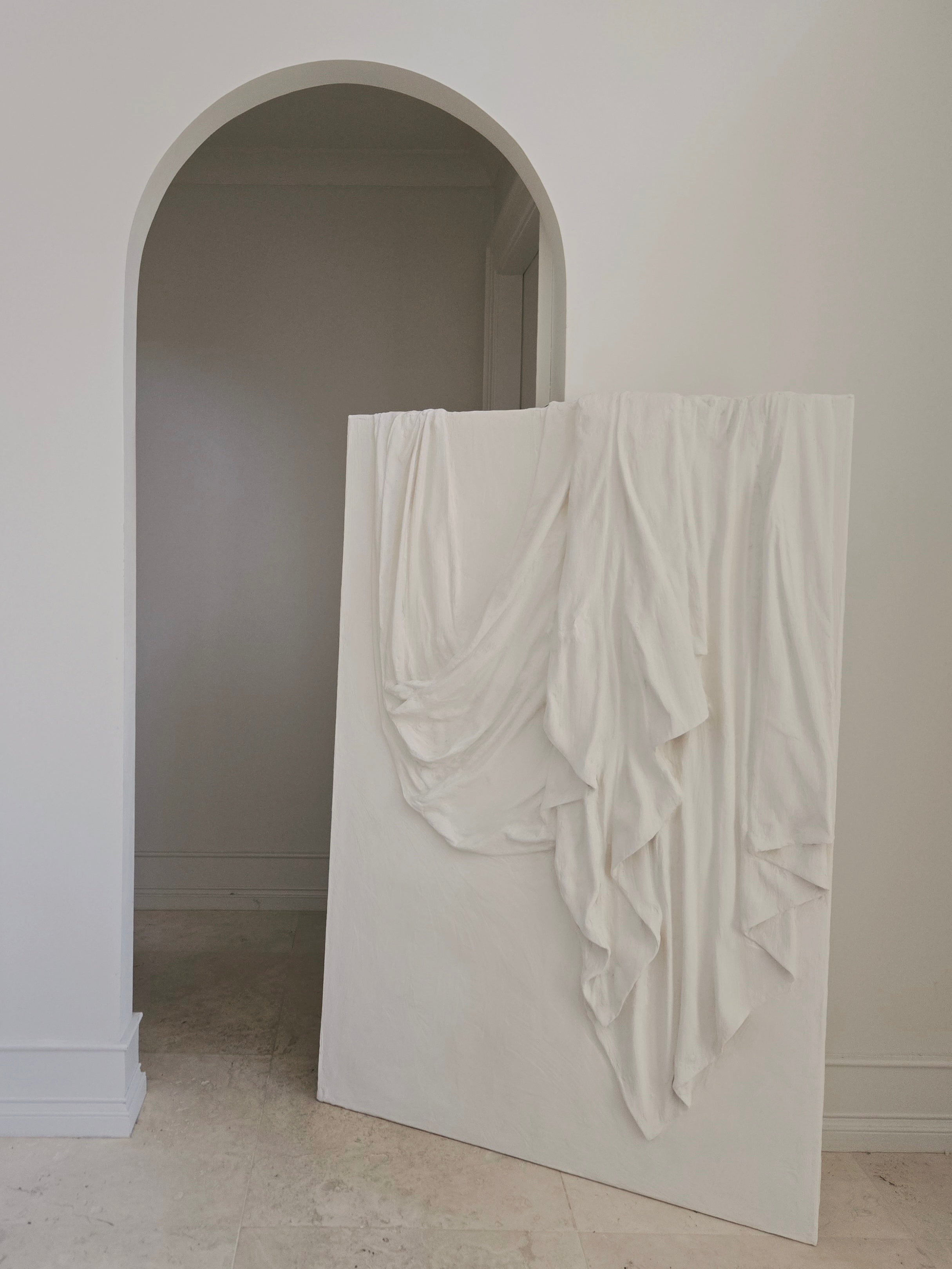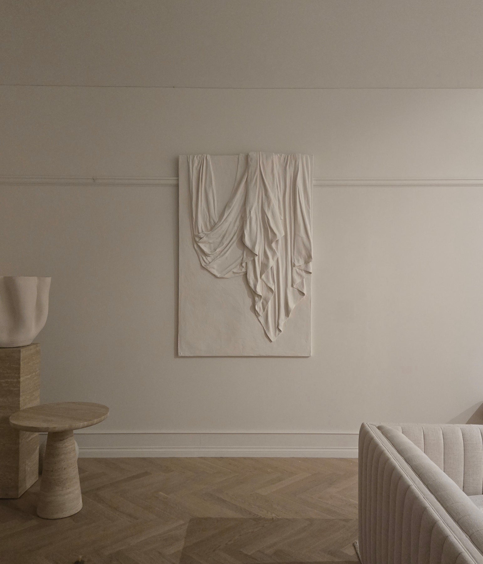 Like the soft flutter of butterfly wings, Papillon captures the delicate poetry of movement in sculpted form. Each drape flows with quiet intention, as though caught mid-breath — light, graceful, and endlessly feminine. Handcrafted in plaster, this work transforms the fluidity of fabric into something timeless and tangible, inviting stillness while evoking flight.