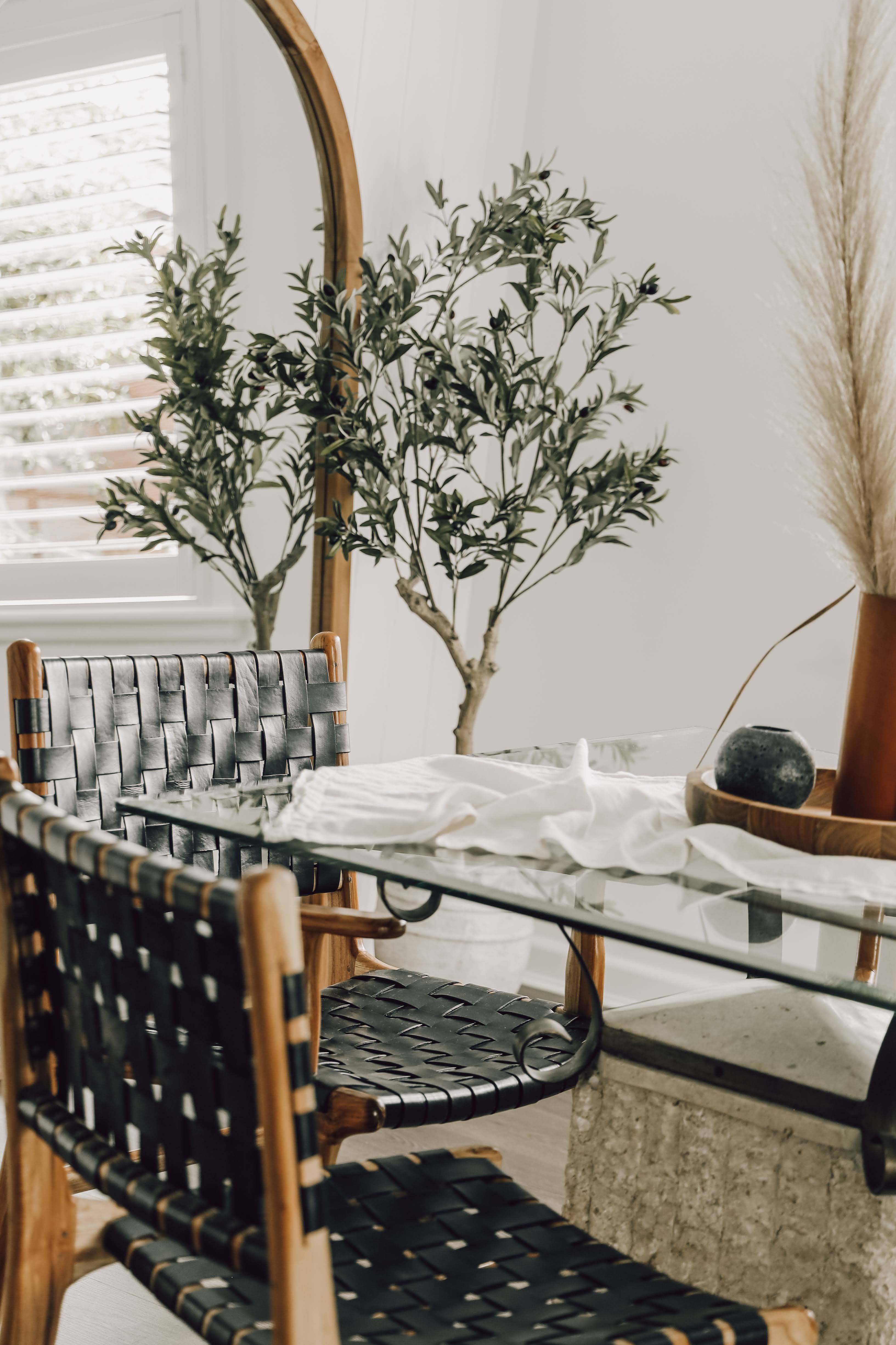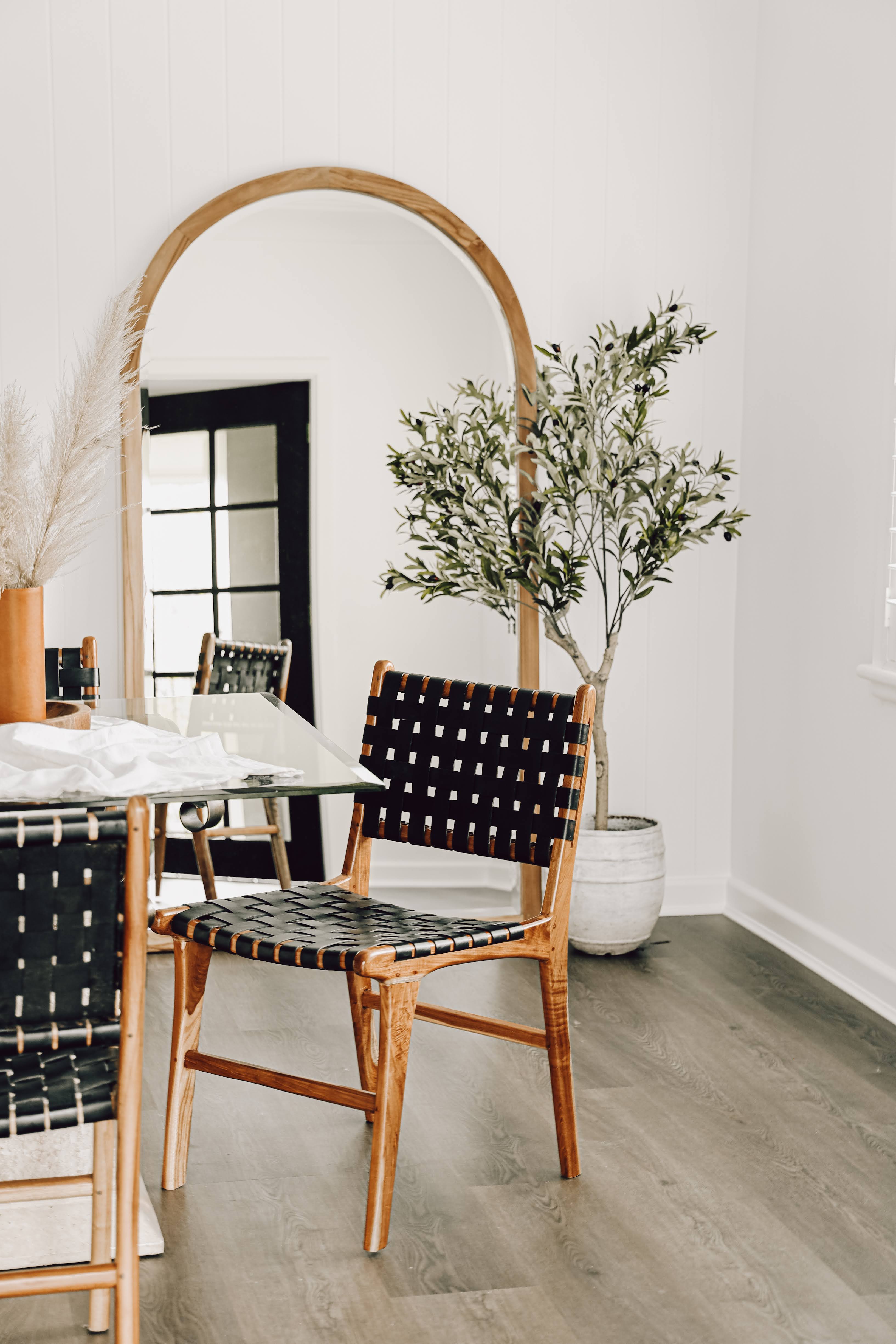 Detail of handwoven leather straps on a woven leather dining chair in natural tones.